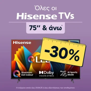 Το Πλαίσιο προσφέρει -30% έκπτωση σε όλες τηλεοράσεις Hisense με διαγώνιο 75” και άνω! Πρόκειται για μοντέλα με προηγμένες τεχνολογίες εικόνας και ήχου, που προσφέρουν ρεαλιστική απεικόνιση και εξαιρετική εμπειρία θέασης, ακόμα και σε μεγάλους χώρους.
