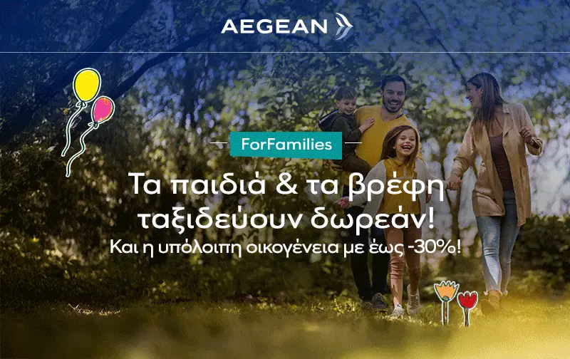 Με την ενέργεια Aegean ForFamilies, τα βρέφη και τα παιδιά έως 11 ετών ταξιδεύουν δωρεάν, ενώ τα υπόλοιπα μέλη της οικογένειας μπορούν να εξασφαλίσουν έως 30% έκπτωση στα εισιτήριά τους, ανάλογα με τον ναύλο που θα επιλέξουν.