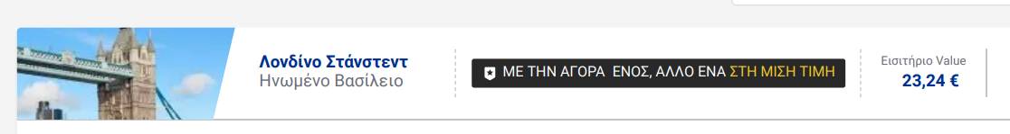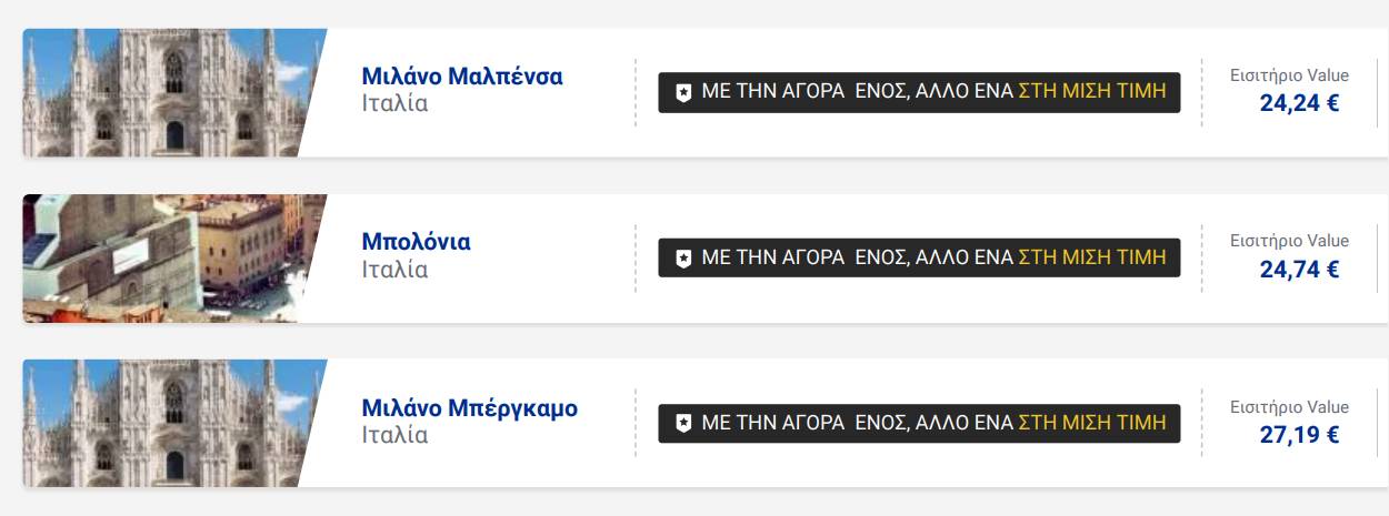 - Η προσφορά «Με την αγορά ενός, άλλο ένα στη μισή τιμή» είναι διαθέσιμη μόνο σε ναύλους Value και μόνο σε επιλεγμένες διαδρομές.